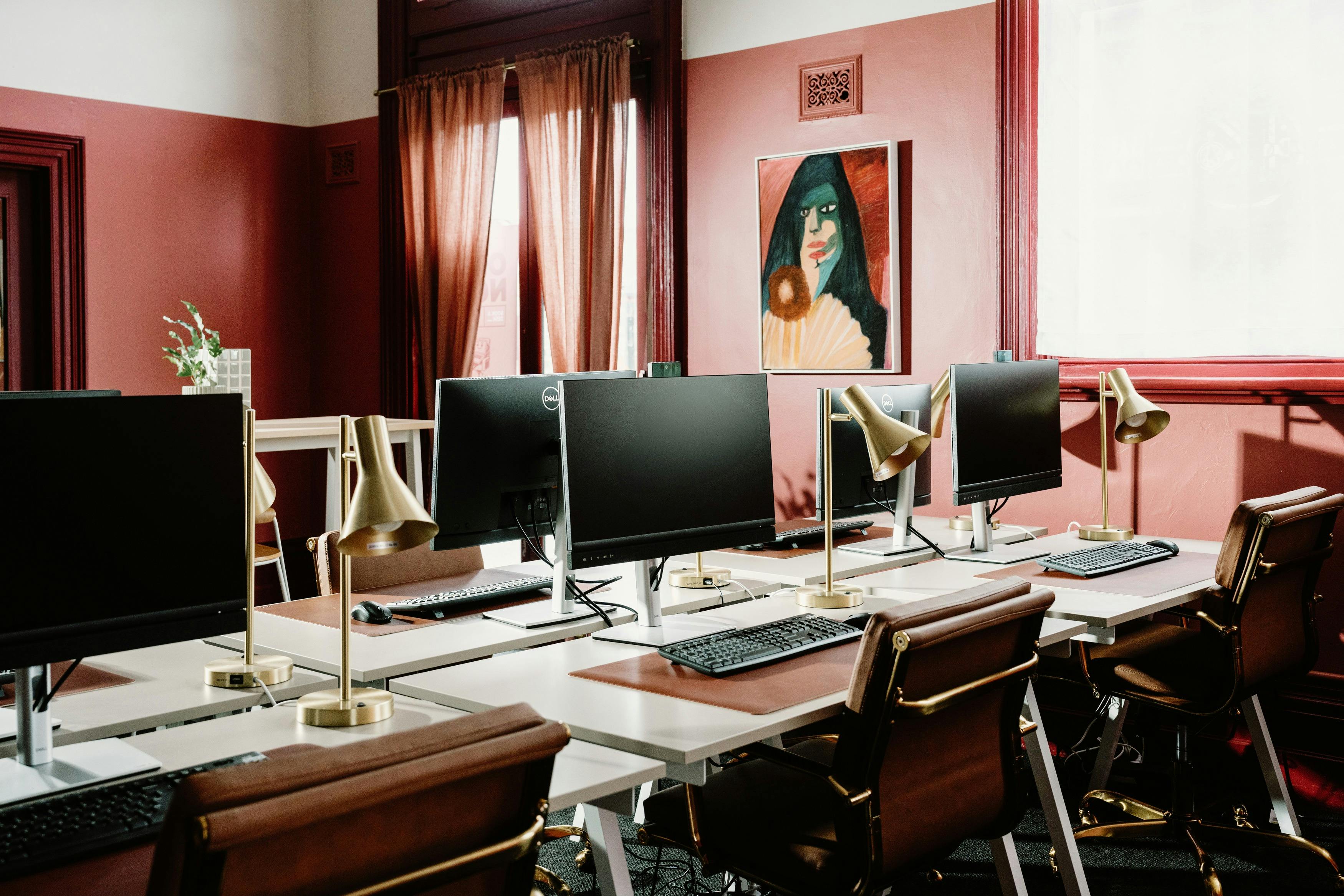 The space includes: desks for hire that each have a monitor, webcam, keyboard and mouse, fully equipped conference room and meeting room, kitchen, courtyard, endless Nespresso coffee and high-speed internet.